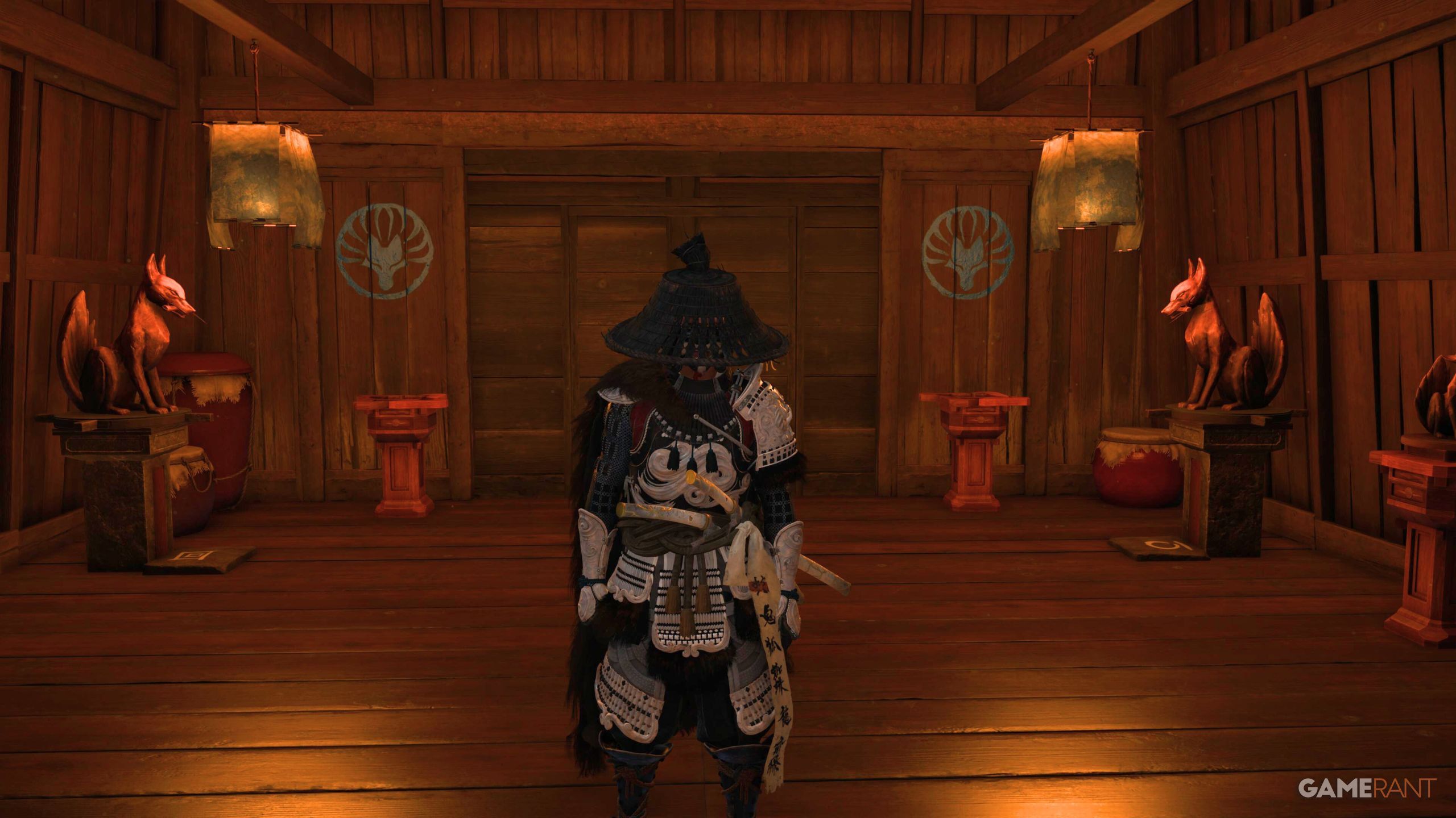 Interact with the fox statues on the left and make them face each other. This will allow you to grab the statue in the middle and place it on the left pedestal. Do the same with the right side and make them face each other. Once you put the other statue down, the wall up ahead will be interactable, and you can go through to reach the Hunting Camp Hideout.